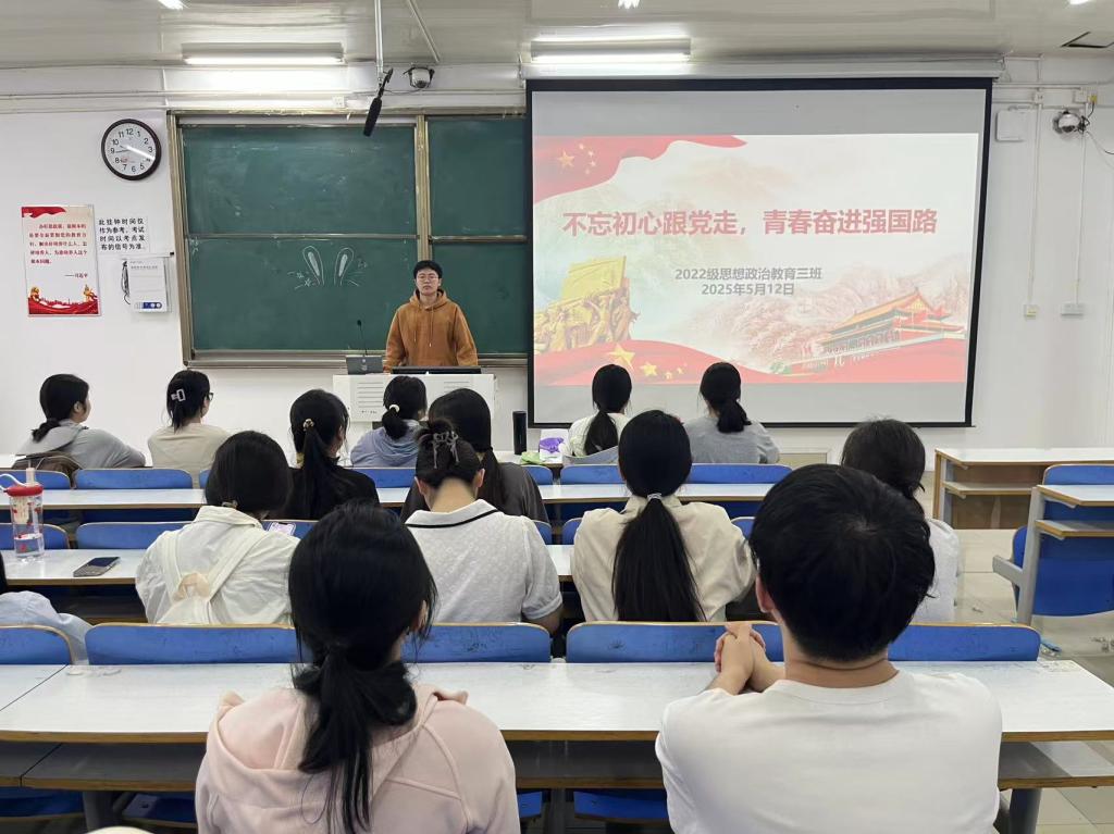 为强化奋斗意识,5月12日上午,beat365亚洲版官网2022级思想政治教育三班在社科楼514教室召开“不忘初心跟党走,青春奋进中国路”主题团课。beat365官网2022级思想政治教育三班全体成员共同参加此次团课,团课由团支书余浩洋主持。