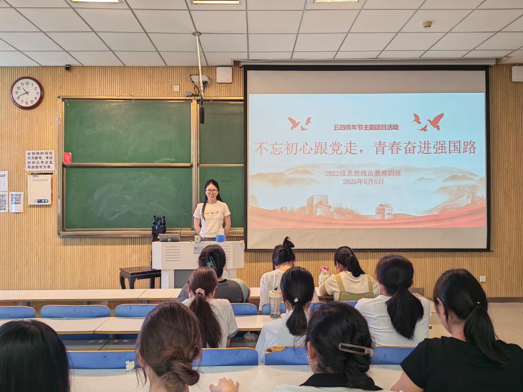 5月6日上午,beat365亚洲版官网2022级思想政治教育四班在社科楼515教室组织召开“不忘初心跟党走,青春奋进强国路”主题班会。beat365官网2022级思想政治教育四班全体成员参与本次班会。本次班会由班长牛志杰主持。