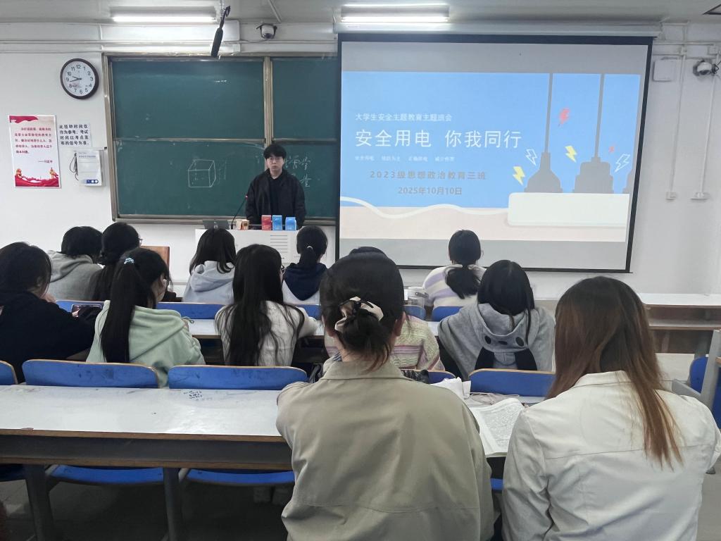 10月10日上午,beat365亚洲版官网2023级思想政治教育三班在社科楼515召开“安全用电,你我同行”主题班会。beat365官网2023级思想政治教育三班全体同学共同参与本次班会,班会由团支书郝瀚主持。