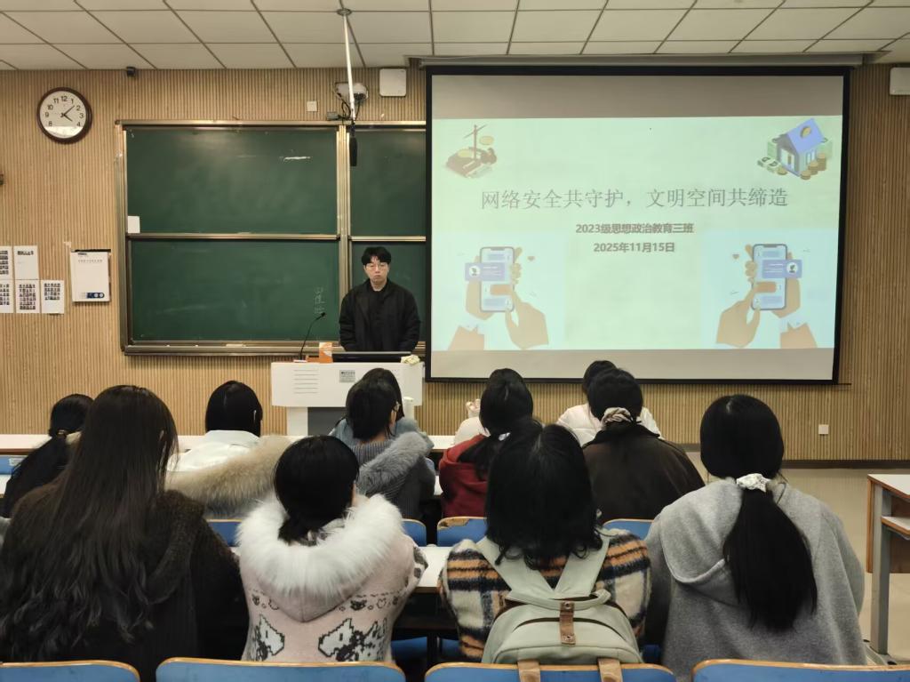 为宣传网络安全知识,避免不法言论对青年学子的误导,11月15日上午,beat365亚洲版官网2023级思想政治教育三班在社科楼515教室召开“网络安全共守护,文明空间共缔造”主题团课。beat365官网2023级思想政治教育三班全体成员共同参加此次团课,团课由团支书郝瀚主持。