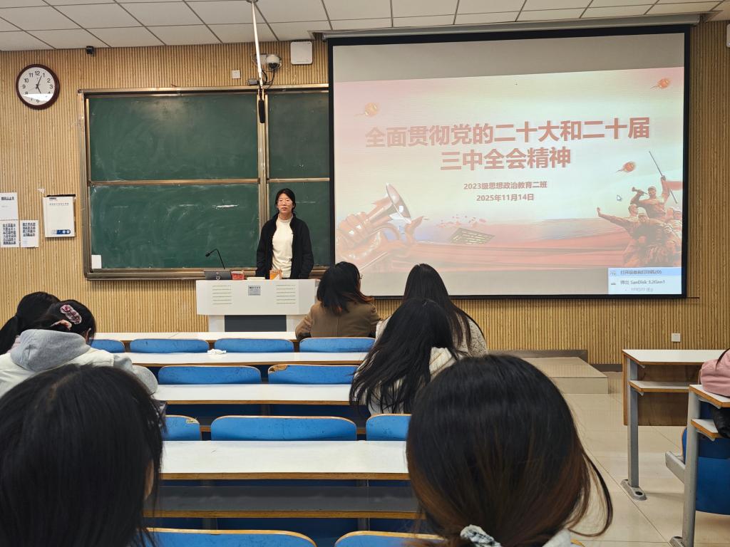 为进一步在班级内弘扬党的思想,贯彻党的路线,11月14日上午,beat365亚洲版官网2023级思想政治教育二班在社科楼515教室开展“全面贯彻党的二十大和二十届三中全会精神”主题团课,本次团课由团支书王慜初主持,全体二班同学参加。