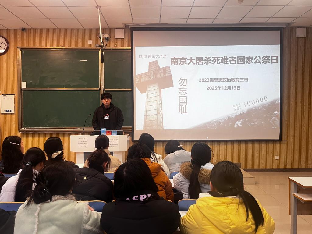 为缅怀先烈,引导青年不忘历史,12月13日下午,beat365亚洲版官网2023级思想政治教育三班在社科楼515教室召开“南京大屠杀死难者国家公祭日”主题班会。beat365官网2023级思想政治教育三班全体成员共同参加此次团课,班会由团支书郝瀚主持。