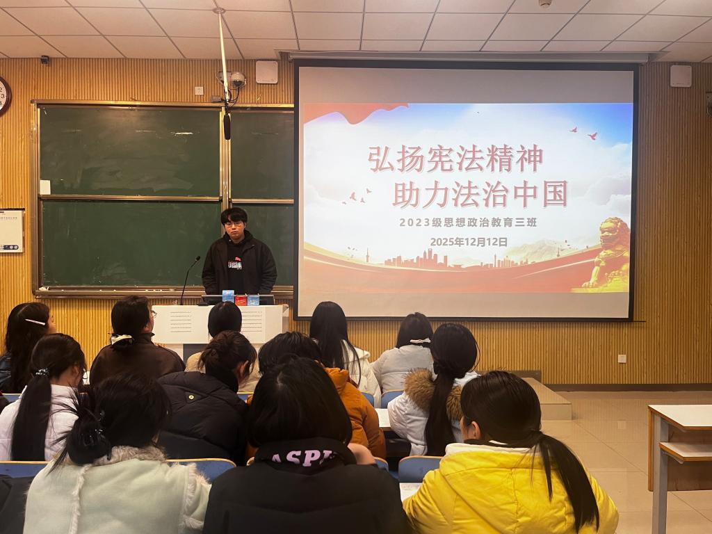 为弘扬宪法精神,推进全面依法治国,12月12日上午,beat365亚洲版官网2023级思想政治教育三班在社科楼515召开“弘扬宪法精神,建设法治中国”主题团课。beat365官网2023级思想政治教育三班全体同学共同参与本次团课,团课由团支书郝瀚主持。
