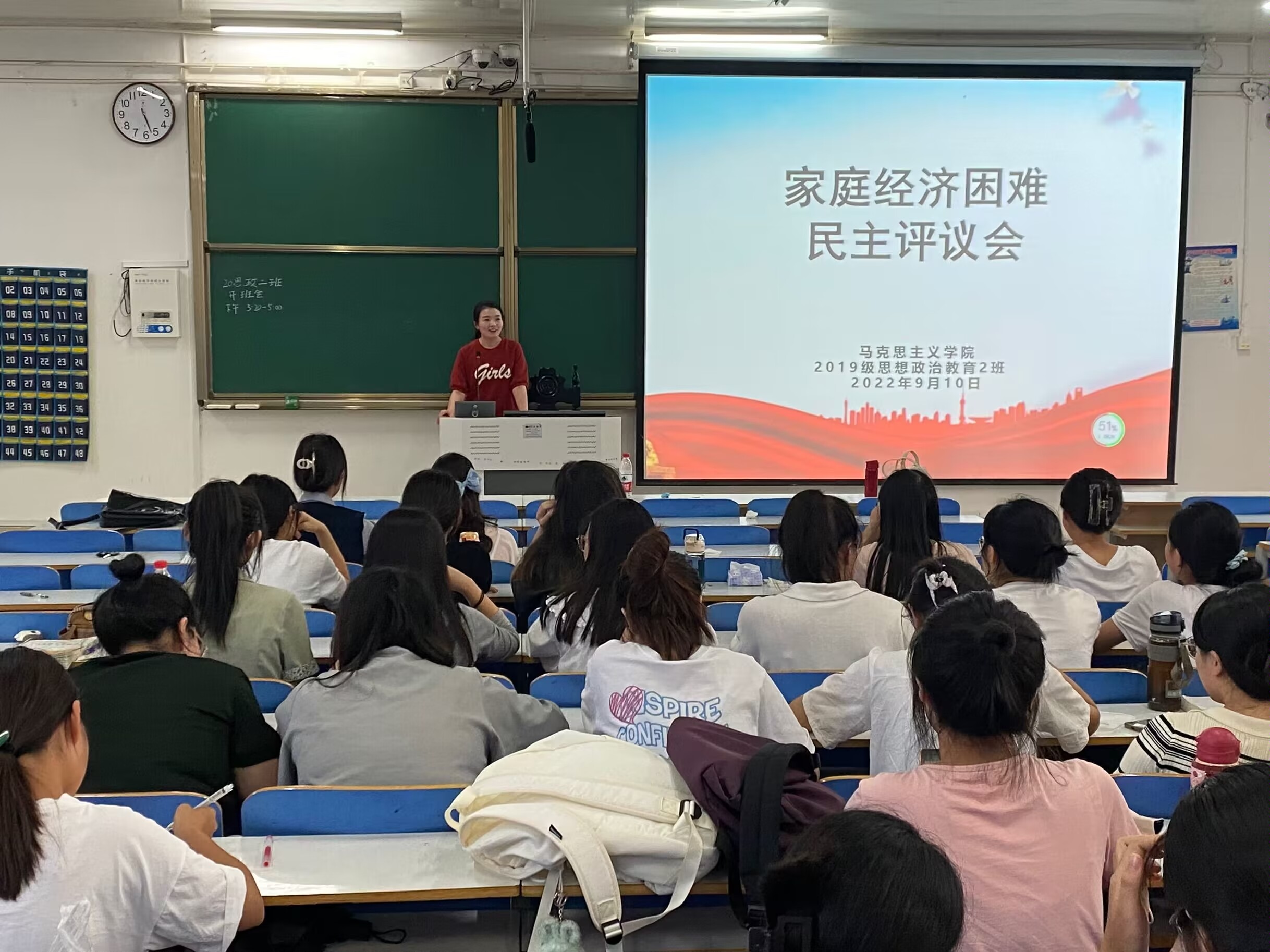 9月10日下午,beat365亚洲版官网2019级思想政治教育二班在社科楼514教室召开2022年班级贫困认定民主评议会。班主任陶青青出席会议,评议小组全体成员按时到会,beat365官网权益保障部监督员全程监督。评议会由班长吕昂主持。