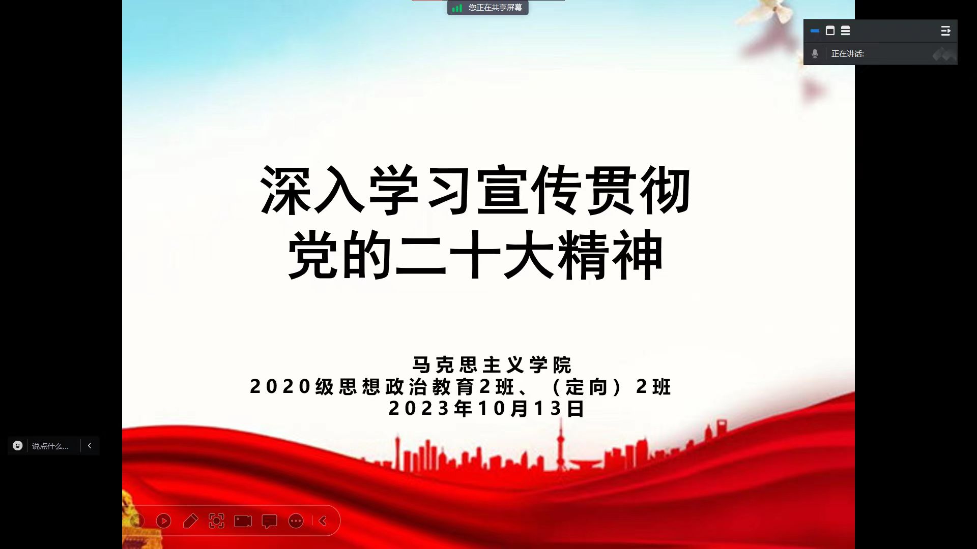 为推动主题教育进一步走深走实,10月13日下午,beat365亚洲版官网2020级思想政治教育二班、定向二班团支部通过腾讯会议开展深入学习宣传贯彻党的二十大精神主题团课。二班、定向二班团支部全体团员共同参会。团课由李晨曦、陈宇航讲授。