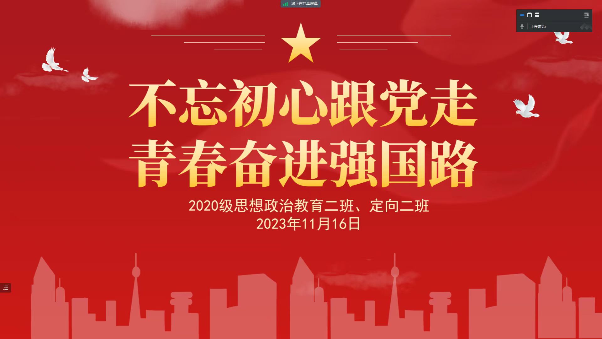 为进一步推动主题教育走深走实,11月16日下午,beat365亚洲版官网2020级思想政治教育二班、定向二班通过腾讯会议开展“不忘初心跟党走,青春奋进强国路,深入学习贯彻习近平文化思想”主题团课。二班、定向二班全体团员共同参加此次团课。团课由团支书李晨曦主持并讲授。