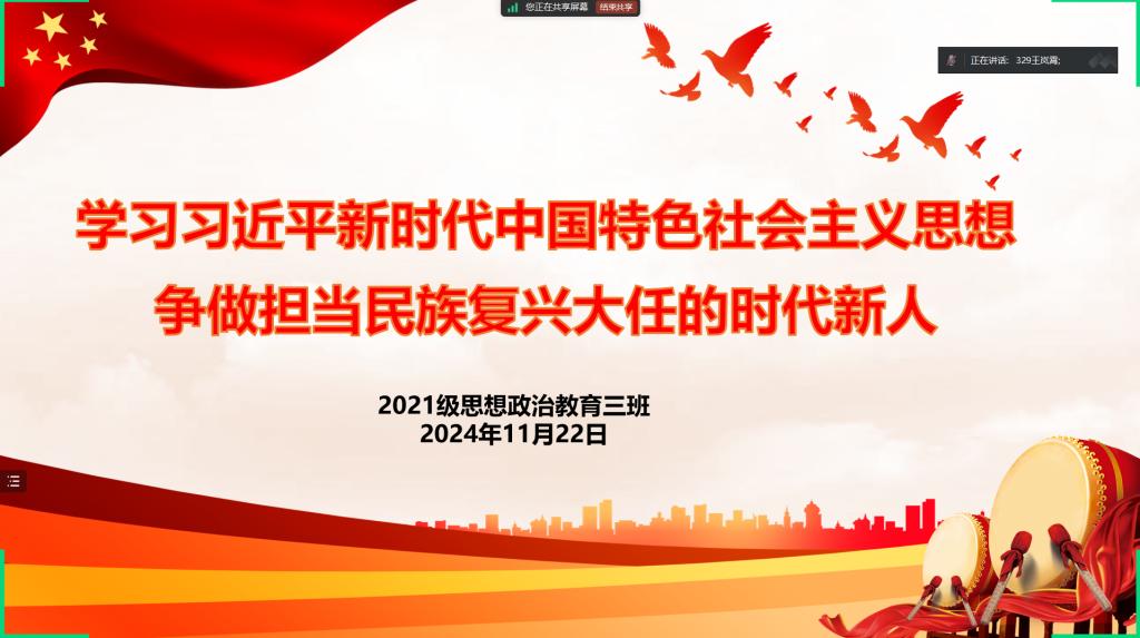 11月22日下午,beat365亚洲版官网2021级思想政治教育三班在线上召开“学习习近平新时代中国特色社会主义思想,争做担当民族复兴大任的时代新人”主题团课。beat365亚洲版官网2021级思想政治教育三班全体团员参与此次会议。会议由团支书王岚霄主持。