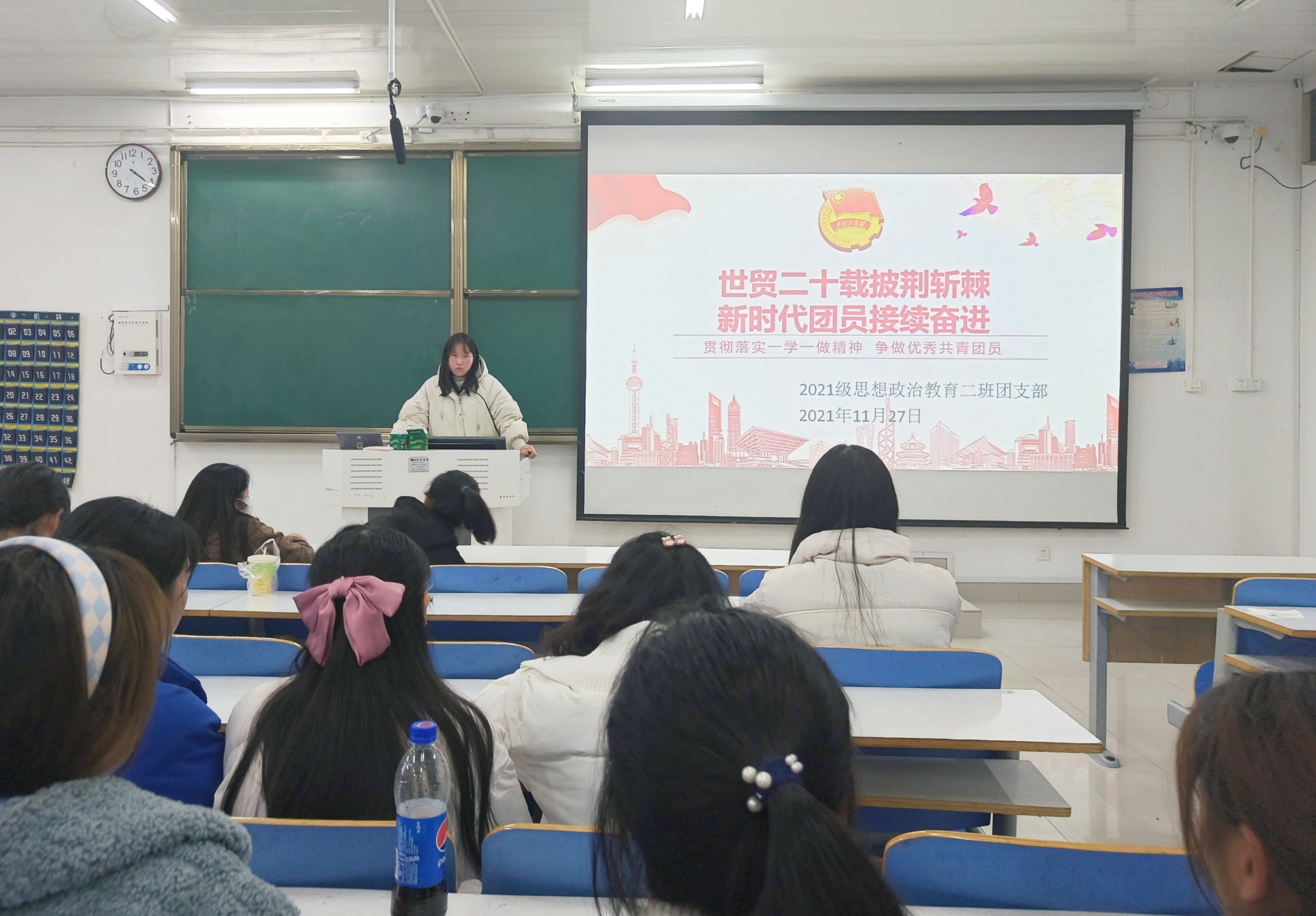 11月27日晚上,beat365亚洲版官网2021级思想政治教育二班在社科楼514教室召开“世贸二十载披荆斩棘,新时代团员接续奋进”主题团课。2021级思想政治教育二班全体同学参加此次团课,团课由团支书王婧欣主持。